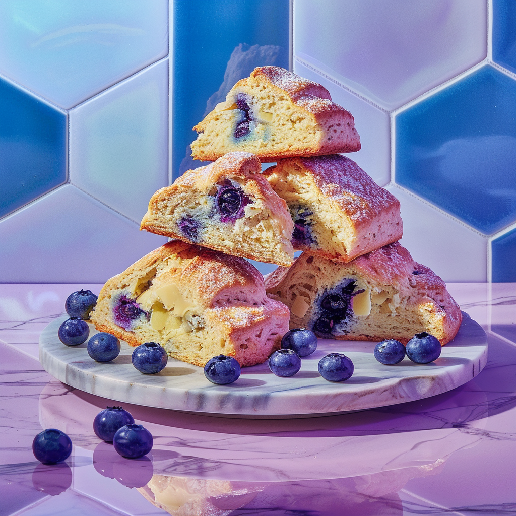 Juicy blueberries baked into golden pastry with a touch of vanilla glaze. The scent of quiet mornings, soft sweaters, and fresh scones cooling by the window.